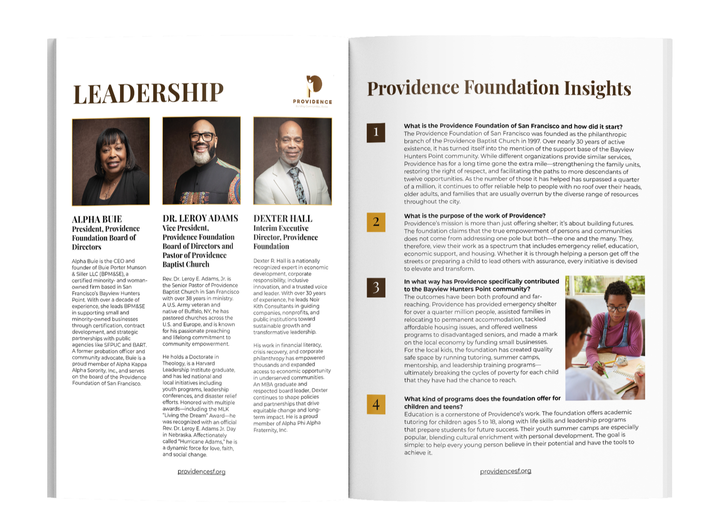 Providence of San Francisco was founded by the Providence Baptist Church, inspired by the vision of Pastor Calvin Jones Jr. As he walked the streets of the Bayview Hunters Point Community, he saw the urgent need to help our community, our children, and the homeless. He declared, “We can and we must do more.” Thus, Providence was born again as a foundation to provide protective care for our communities.